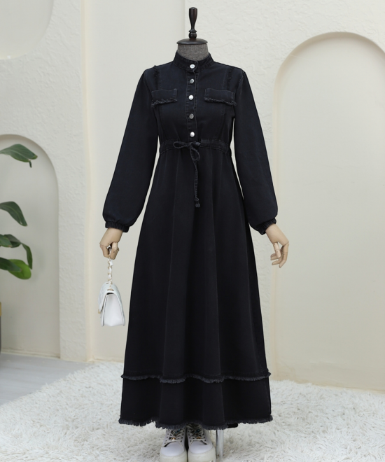 Denim Dress with Tunnel Drawstring Waist and Fringed Hem