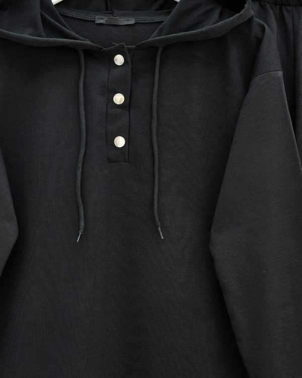 Our set, featuring a half-snap front closure, hood, and slit details, with elastic-waist wide-leg pants, is among the most popular new season designs.